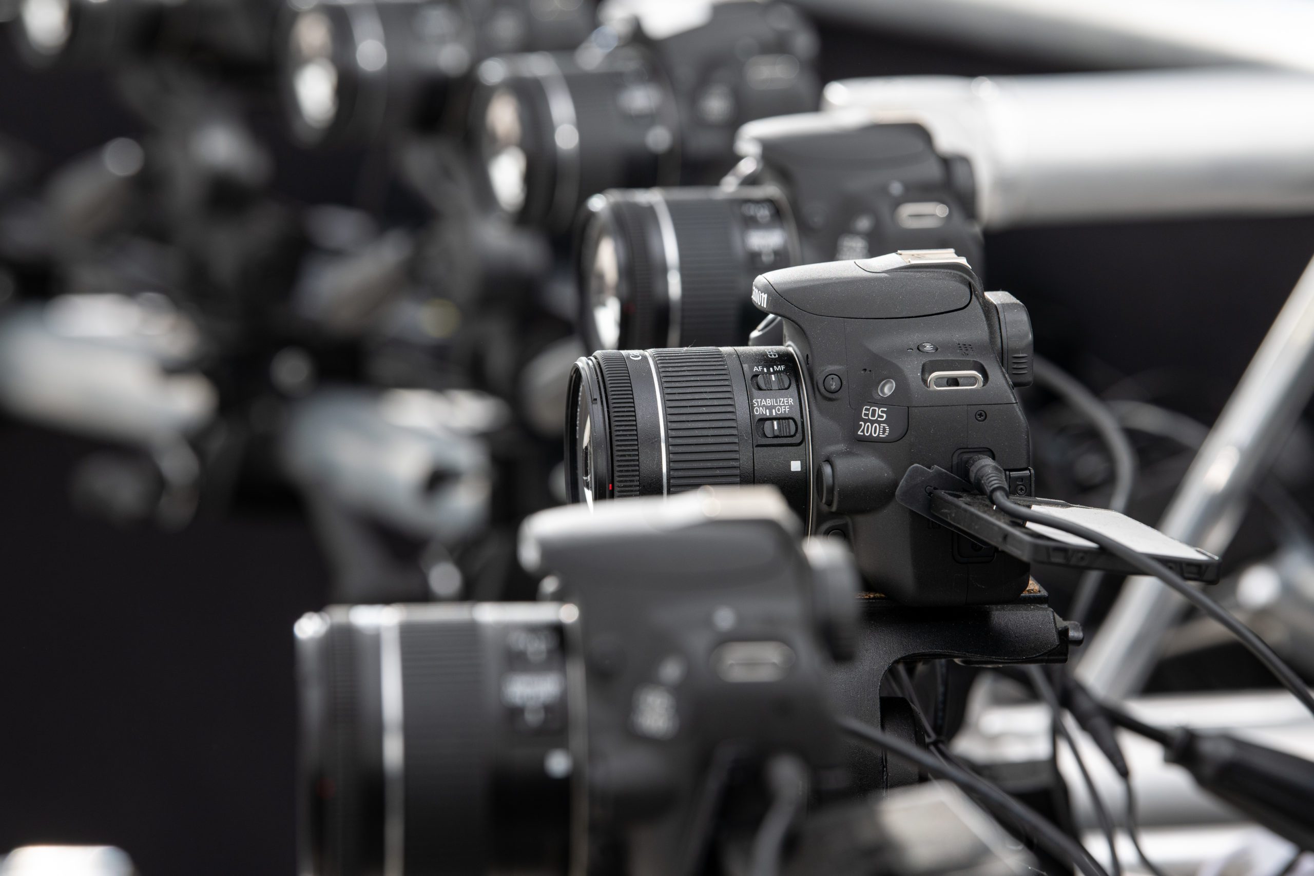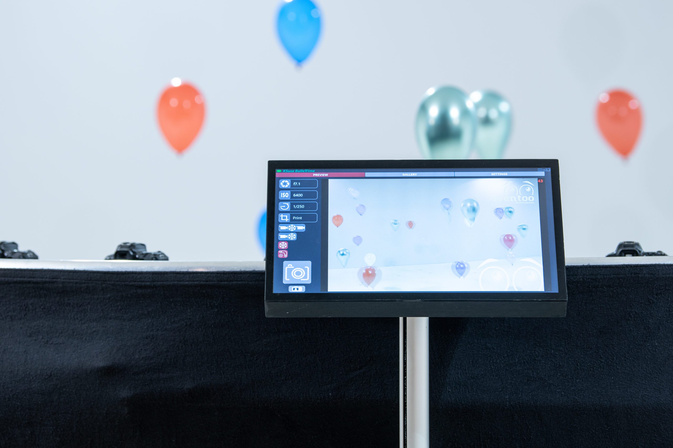 freezzFRAME ist derzeit unser aufwendigstes System: Eine Reihe von Spiegelreflexkameras, die auf einem bogenförmigen Gestell montiert sind, wird gleichzeitig ausgelöst. Diese aus leicht unterschiedlichen Perspektiven aufgenommenen Fotos ermöglichen es, einen kurzen Clip mit einem verblüffenden Effekt zu erstellen: Wie im Film „Matrix“ hat man den Eindruck, dass die Kamera sich um eine in der Bewegung erstarrte Person herumbewegt. Die kleine Variante des freezzFRAME besteht aus zwanzig Kameras, die in einem 90 bis 360-Grad-Winkel angeordnet sind, und kann eine einzelne oder zwei eng beieinander stehende Personen aufnehmen.